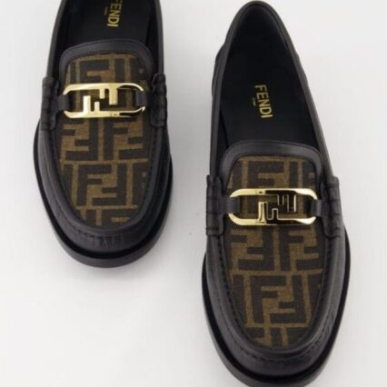 Status: Original Brand: Fendi Color: Black Material Composition: 65% polyamide, 35% cotton, 55% cotton, 45% polyamide, coating: 100%resin, 100% calf leather inside: 100% calf leather Loafers with visible stitched shoe apron and upper decorated with Fendi O’Lock detail. Made of black leather with FF jacquard fabric insert. Gold-finish metalware.