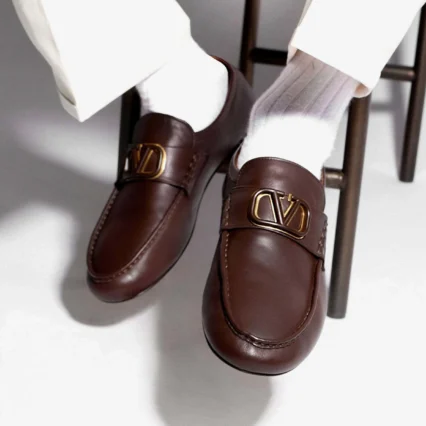 Status: Original Brand: Valentino Garavani Color: Brown Material Composition:                                  Outer: Polyester 100%, Bos Taurus 100%                                  Lining: Goat Skin 100%, Bos Taurus 100%                                  Sole: Bos Taurus 100%                                  Metal 100% Valentino Garavani presents its take on classic loafers: crafted from leather in a black hue, the pair boasts a timeless silhouette and stands out thanks to the instantly recognisable VLogo Signature on top. Highlights: