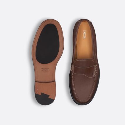 Status: Original Brand: Christian Dior Color: Brown Material Composition: Grained Calfskin Details: The Dior Granville loafer presents a refined version of an urban shoe. Made in black grained calfskin with contrasting topstitching, the style is embellished with a tonal Saddle band on the vamp. The creation is completed by a leather sole and an engraved Dior signature on the back. The shoe can be worn with any seasonal attire for an elegant and timeless look.