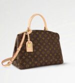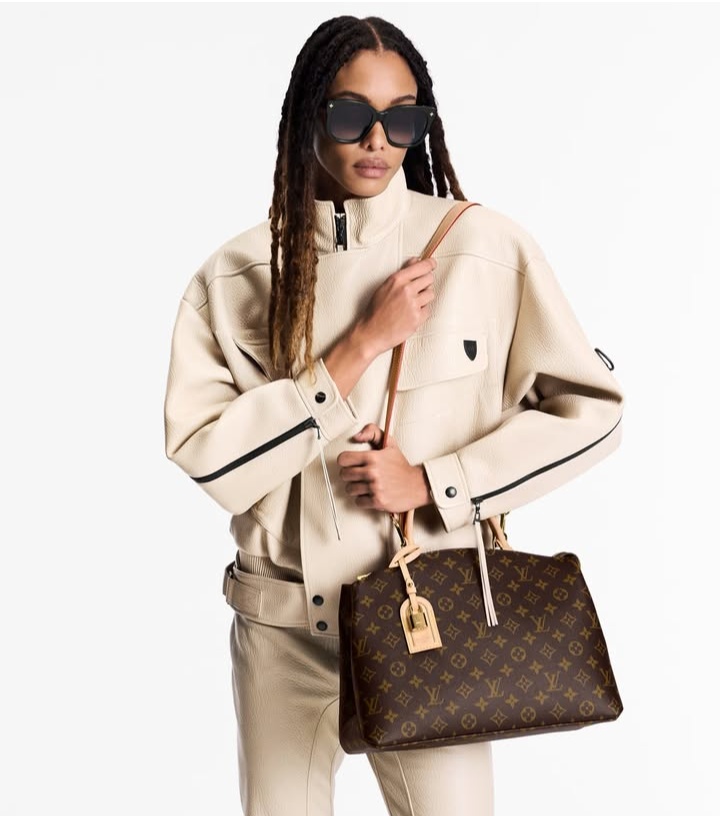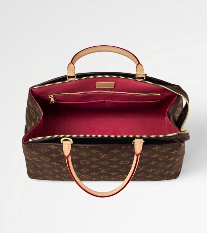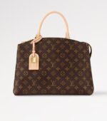 Inspired by the iconic Lockit from 2011 and the shape of the Montaigne launched in 2014, the new Grand Palais tote is as versatile as it is feminine. Made from Monogram canvas with natural-leather trim, its interior features a vivid red lining and a Louis Vuitton patch. The removable strap and top handles give carry options.