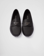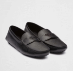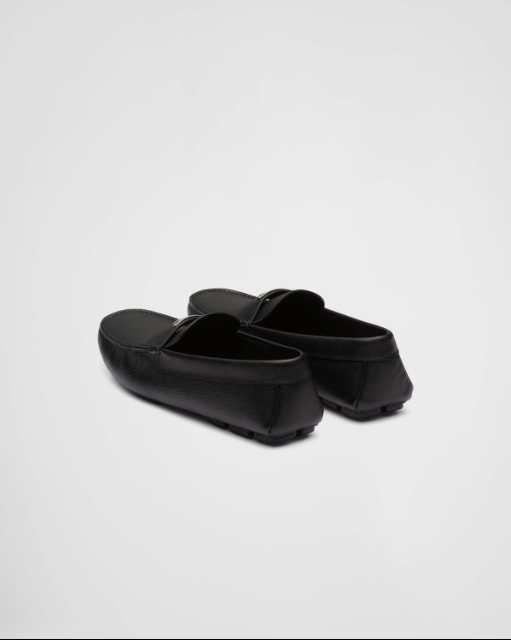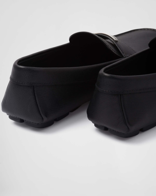 These deconstructed loafers made of fine Saffiano leather express casual elegance. The shoe is accented by the iconic logo on the strap and the rubber sole with tortoiseshell tread.